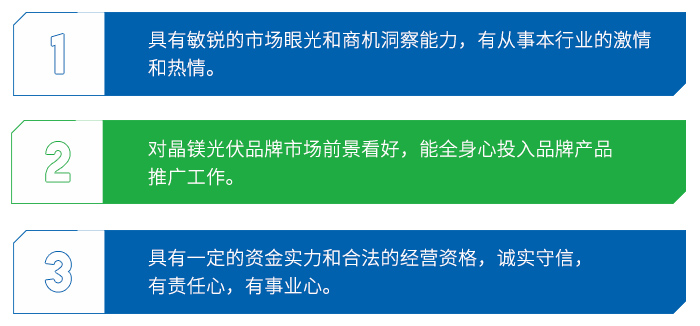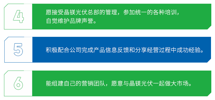 晶镁科技光伏品牌,一个创新型科技体系,一个绿色环保清洁能源领跑者,一项行业标新创举,"蓝屋顶工程计划"更是响应国家号召,谱惠万民的阳光行动,必将迎来市场井喷式发展,带来全新商机,我们期待勇于创新、敢闯敢拼的有志之士携手加入。现已全面开放国内市场,面向全国招商。